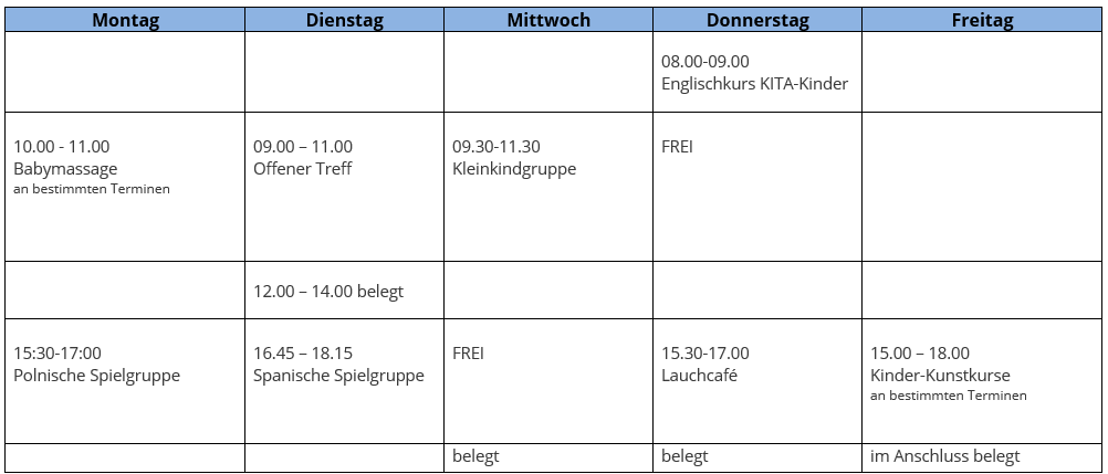 Auch der Mittwochnachmittag oder der Donnerstagvormittag sind noch frei für eine neue Gruppe, ein Angebot oder einen offenen Treff. Bei Interesse gerne im FAZ melden-